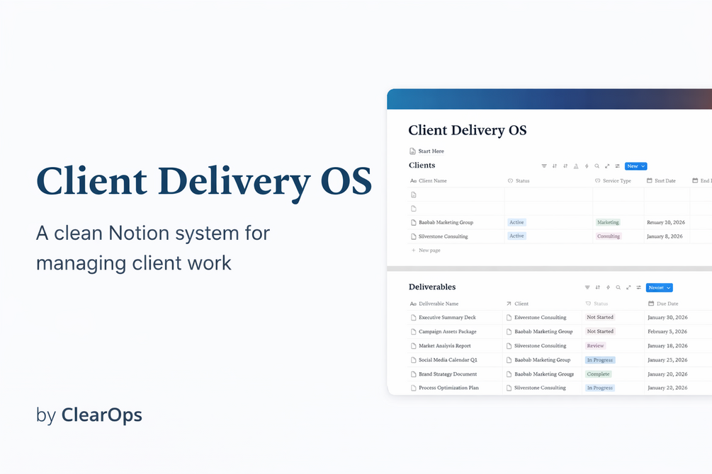 A clean Notion operating system for managing clients, deliverables, meetings, and payments.